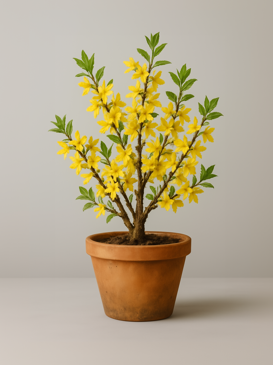 Forsythia (Forsythia × intermedia) is a fast-growing, deciduous shrub in the Oleaceae (olive) family, celebrated for its vivid yellow flowers that bloom in early spring before the leaves emerge. It typically grows 2–3 metres tall and wide, creating a bright and cheerful display that signals the start of the growing season.