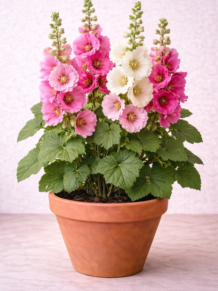 Hollyhock (Alcea rosea) is a tall, biennial or short-lived perennial flowering plant that typically grows to 1.5–2.5 metres tall, producing large, showy flowers in a wide range of colours, including pink, red, white, yellow, and purple. Blooming from midsummer to early autumn, its flowers attract bees, butterflies, and other pollinators, making it a valuable addition to both ornamental and wildlife-friendly gardens. Hollyhocks are particularly striking when grown against walls, fences, or in cottage garden-style plantings.